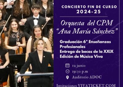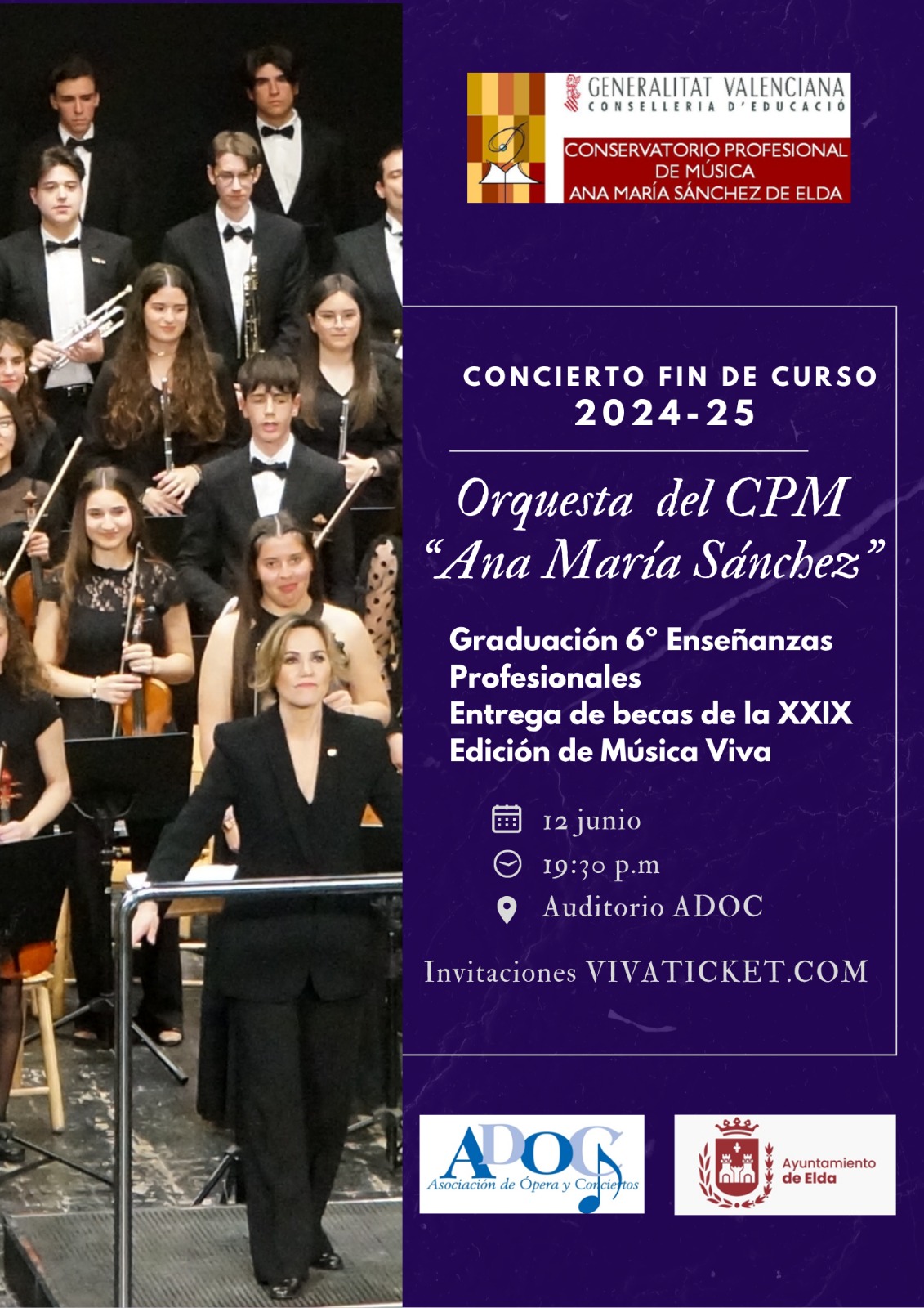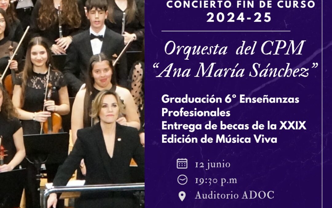 El próximo jueves 12 de junio a las 19:30 horas, el Auditorio ADOC acogerá el Concierto de Fin de Curso 2024-2025 de la Orquesta del Conservatorio Profesional de Música Ana María Sánchez, en un acto que pondrá el broche final al curso académico con un programa especial cargado de emoción, talento y reconocimiento.