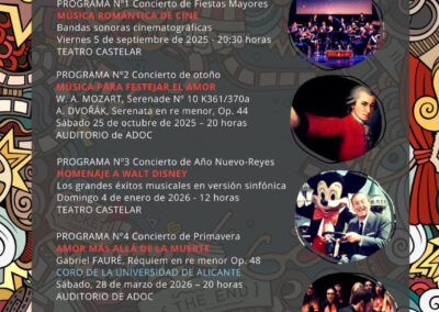 El cuarto concierto, que se celebrará el sábado 28 de marzo de 2026 a las 20 horas en el Auditorio ADOC, estará dedicado al amor que trasciende la vida y a la memoria de los seres queridos. La orquesta interpretará el ‘Réquiem en re menor, Op. 48’ de Gabriel Fauré junto al Coro de la Universidad de Alicante, bajo la dirección de Shlomo Rodríguez. Esta obra, de extraordinaria belleza y serenidad, constituye un ejemplo paradigmático de la expresión del amor más allá de la muerte y se inscribe junto a los grandes réquiems de Mozart, Verdi o Brahms como una composición de profunda carga emocional y espiritual.