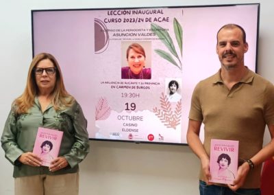 Por su parte, Concha Maestre ha explicado que «en esta lección inaugural nos hablará de la influencia de Alicante y su provincia en Carmen de Burgos, tema relacionado con su libro ‘Revivir. La nueva Carmen de Burgos’, una biografía de la escritora y periodista conocida como Colombine. En esta obra, a través de la figura de Burgos, Valdés nos traslada al periodismo ejercido por mujeres en el siglo XX».