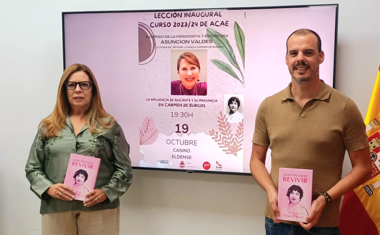 La periodista y escritora Asunción Valdés será la encargada de presentar la lección inaugural del curso 2023-2024 de la Asociación Cultural Aulas de Elda (ACAE). El acto tendrá lugar el próximo 19 de octubre a las 19.30 horas en el Casino Eldense. El concejal de Cultura, Iñaki Pérez, junto a la directora de ACAE, Concha Maestre, han dado a conocer los detalles de un acto que traerá a Elda a un referente en el ámbito comunicativo como es Asunción Valdés, quien ha trabajado en varios medios de comunicación (RNE y RTVE, además de los diarios Patria, La Verdad de Alicante, Información y El País).