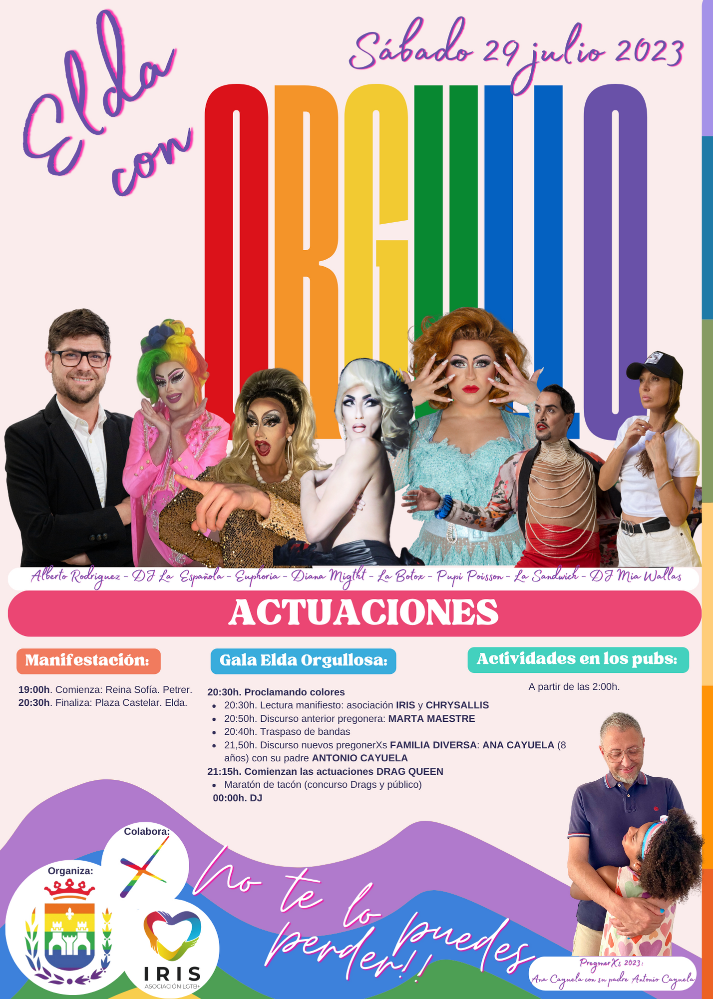 La gala en la Plaza Castelar, presentada por el eldense Alberto Rodríguez, dará comienzo a las 20:30 horas y, tras la lectura del Manifiesto y del Pregón del Orgullo, a manos de Ana Cayuela, una niña de 8 años, y de su padre, Antonio Cayuela, comenzará la fiesta DRAG QUEEN con actuaciones y el maratón de tacón.