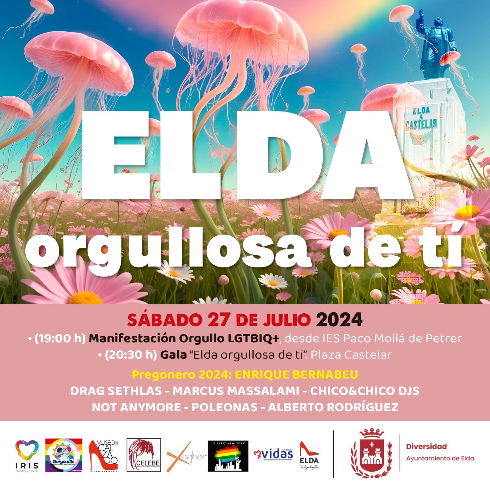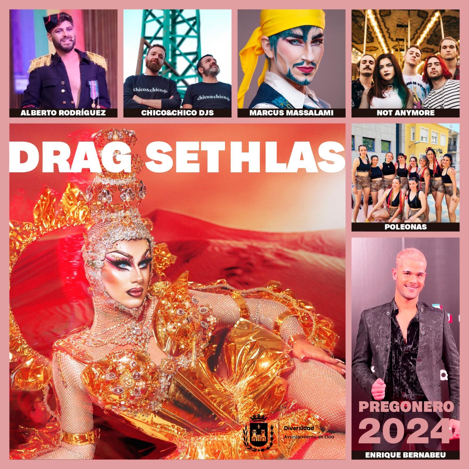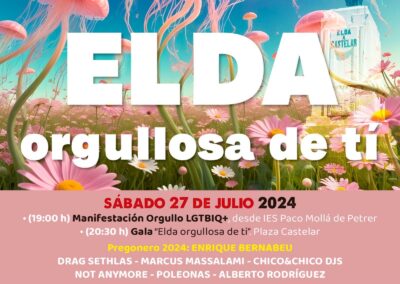 La gala en la Plaza Castelar, presentada por el eldense Alberto Rodríguez, dará comienzo a las 20:30 horas y contará con la presencia del conocido Drag Sethlas, ganador de Drag Race España: AllStars y dos veces ganador de la Gala Drag Queen de Las Palmas de Gran Canaria. Tras la lectura del Manifiesto y del Pregón del Orgullo, a manos de Enrique Bernabéu, influencer y autor del libro ‘Trece vidas resilientes’, comenzarán las actuaciones en vivo de Marcus Malassani, Chico y Chico DJ, Not Anymore y Poleonas.