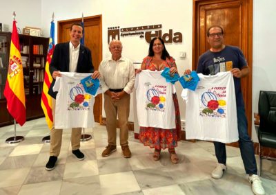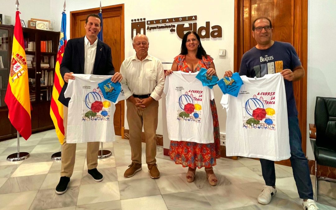 Por otra parte, el alcalde de Elda, Rubén Alfaro; el concejal de Fiestas, David Guardiola, y la pregonera de las Fiestas Mayores 2023, Loli Soler, han recibido esta mañana de manos de Ramón González, presidente de la Cofradía de los Santos Patronos, la camiseta y el pañuelo personalizados para ‘correr la traca’. Hay que recordar que la ilustración de la camiseta es obra del grupo artístico Matices.