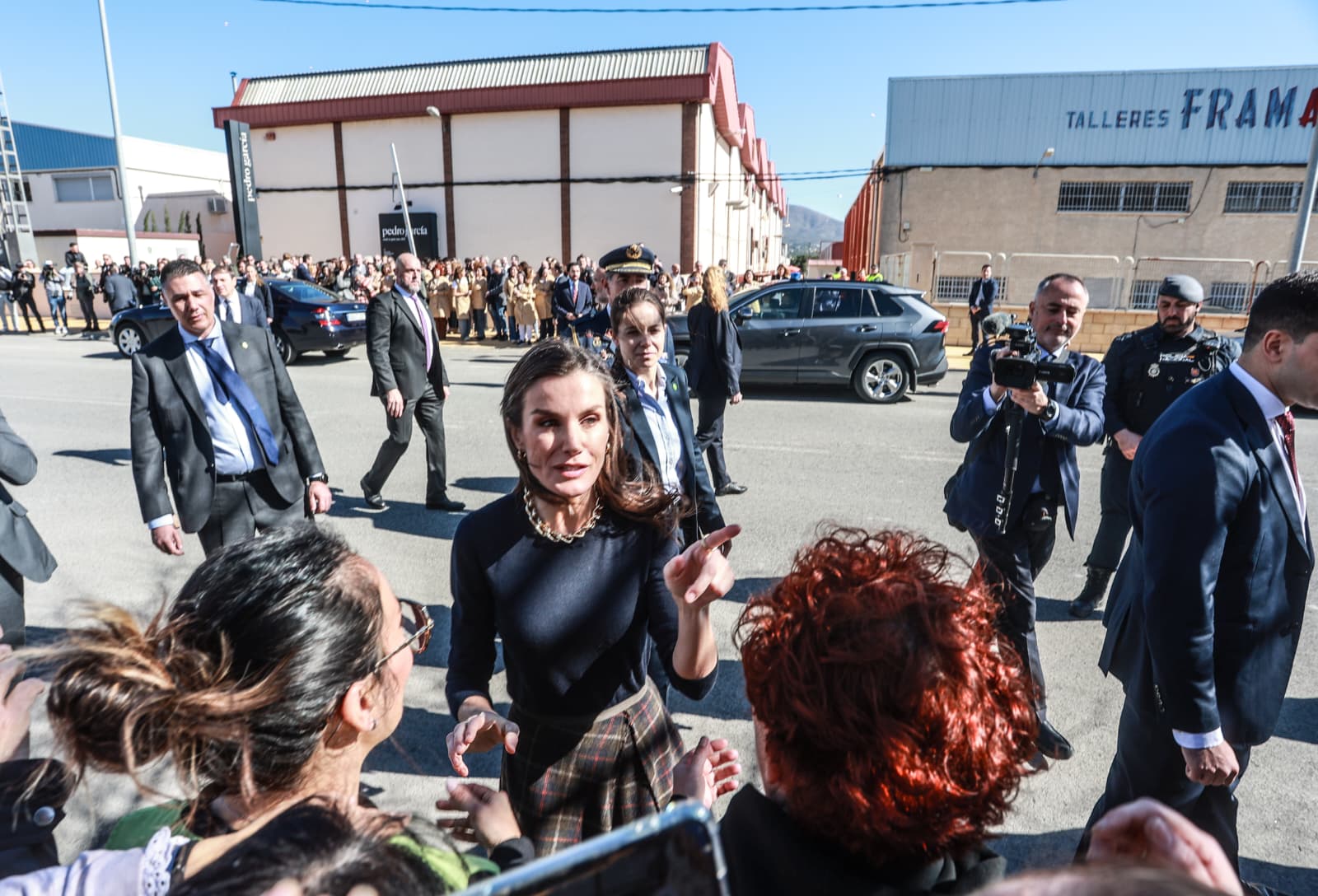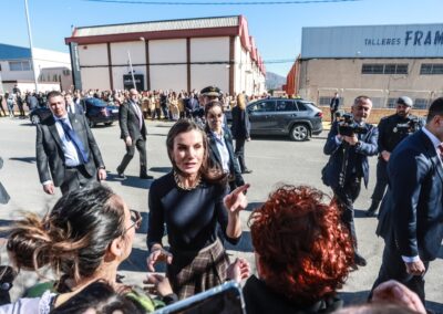 Antes de iniciar el recorrido oficial por las instalaciones, doña Letizia ha saludado a las decenas de trabajadores y trabajadoras de otras empresas del Polígono Campo Alto, así como a numerosos vecinos y vecinas de Elda que se habían congregado desde primera hora en las inmediaciones de la fábrica para darle una cálida bienvenida.