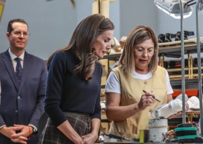 Ya en el interior de la factoría, la reina ha recorrido las diferentes secciones que componen la cadena de producción. Durante el trayecto, se ha detenido a conversar y saludar a los y las operarias, mostrando un gran interés por su labor diaria, el nivel de especialización requerido y los detalles técnicos de la fabricación del calzado.