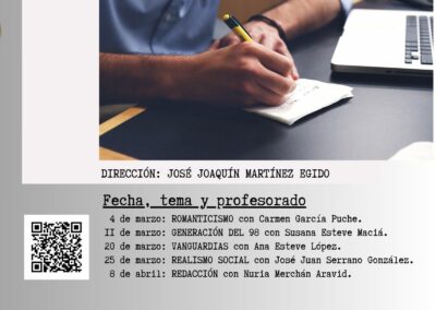 Las fechas y temas de las clases son: 4 de marzo. Romanticismo, a cargo de Carmen García Puche; 11 de marzo, Generación del 98, con Susana Esteve; 20 de marzo, Vanguardias, con Ana Esteve; 25 de marzo, Realismo Social, con José Juan Serrano; y 8 de abril, Redacción, con Nuria Merchán.