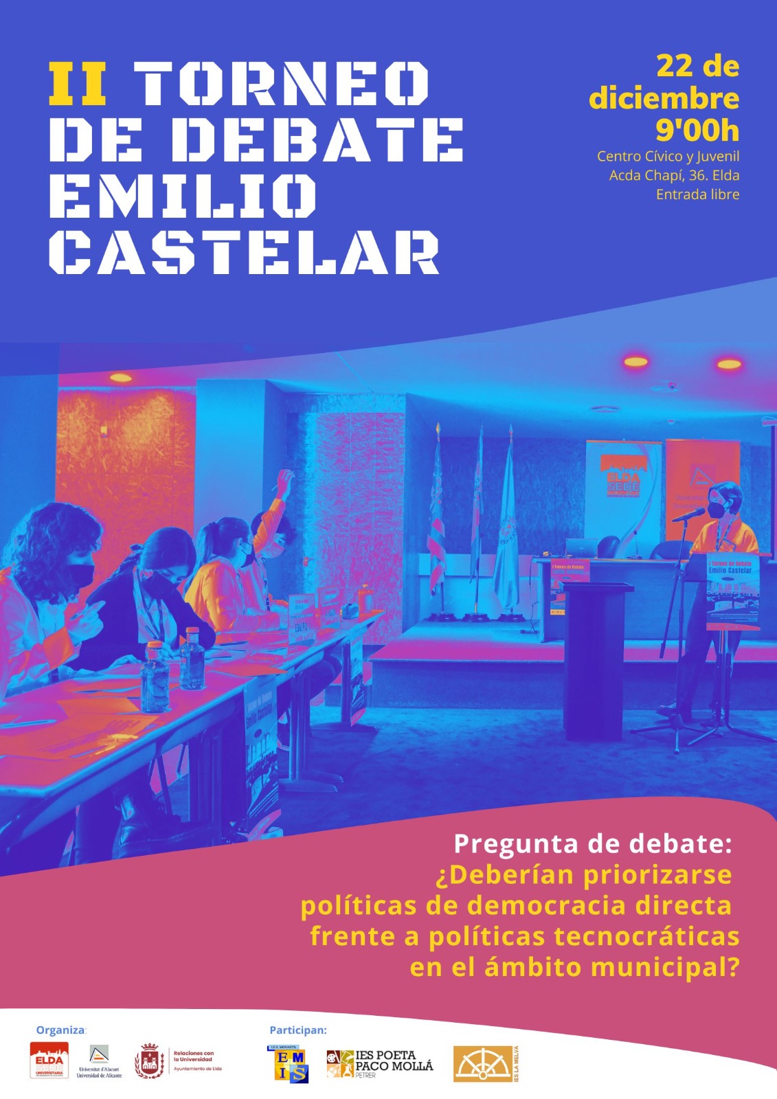 El jueves, día 22 de diciembre, a partir de las 9’00h en el Centro Cívico y Juvenil de Elda, tendrá lugar la segunda edición del Torneo de debate “Emilio Castelar” que toma el nombre de un personaje muy querido por la ciudad de Elda y uno de los mejores oradores de la historia de nuestro país. Amado Navalón, concejal de Relaciones con la Universidad, apunta que “la iniciativa que se inició en el curso pasado está organizada por la Sede Universitaria de Elda de la Universidad de Alicante y la Concejalía de Relación con la Universidad, y pretende convertirse en cita anual para el debate en la comarca. En esta ocasión debatirán 22 alumnos de los IES Monastil, La Melva y Pacó Mollà, que han estado preparándose durante meses, desde que los capitanes de distintos centros empezaran la formación en liga de debate el pasado mes de julio”.