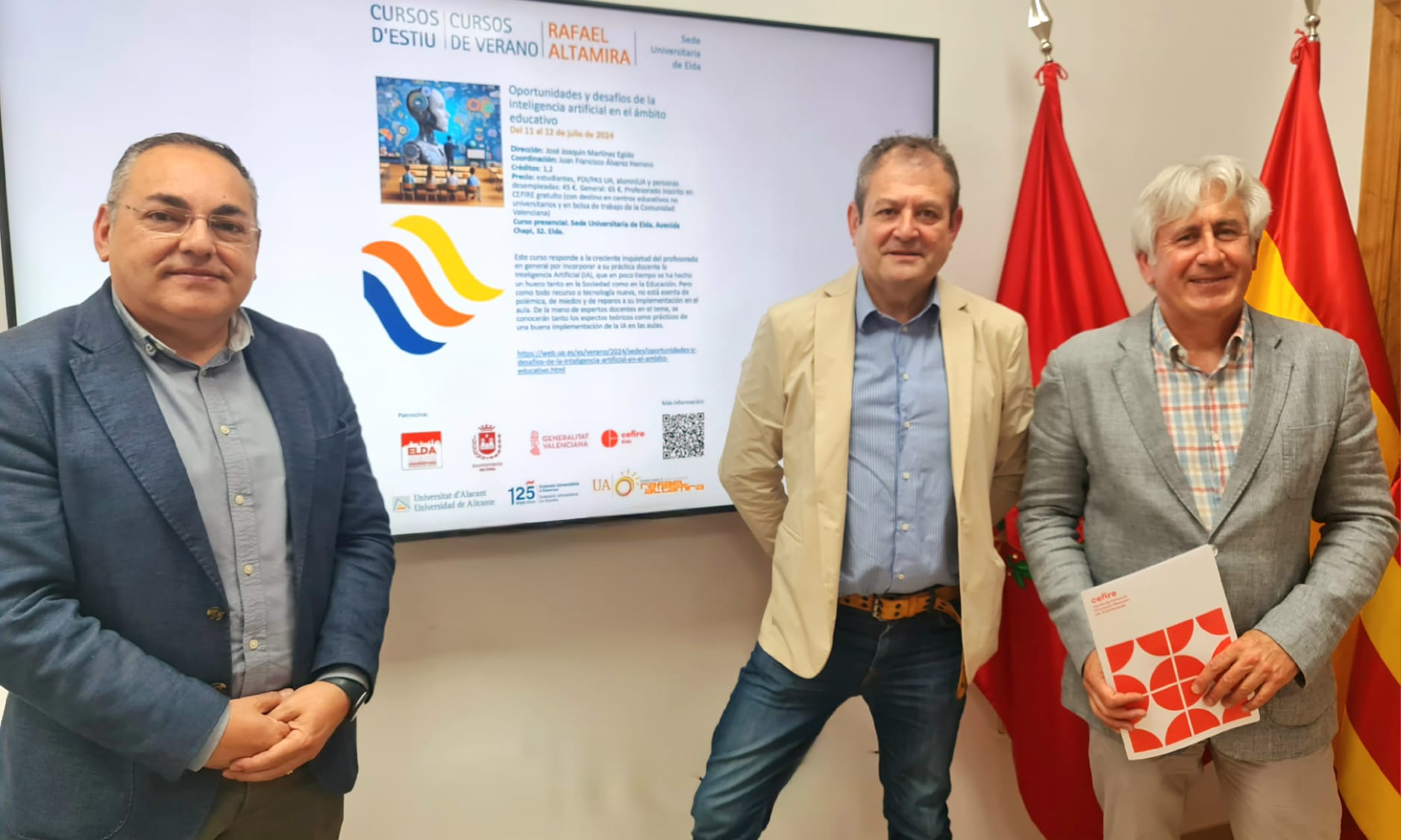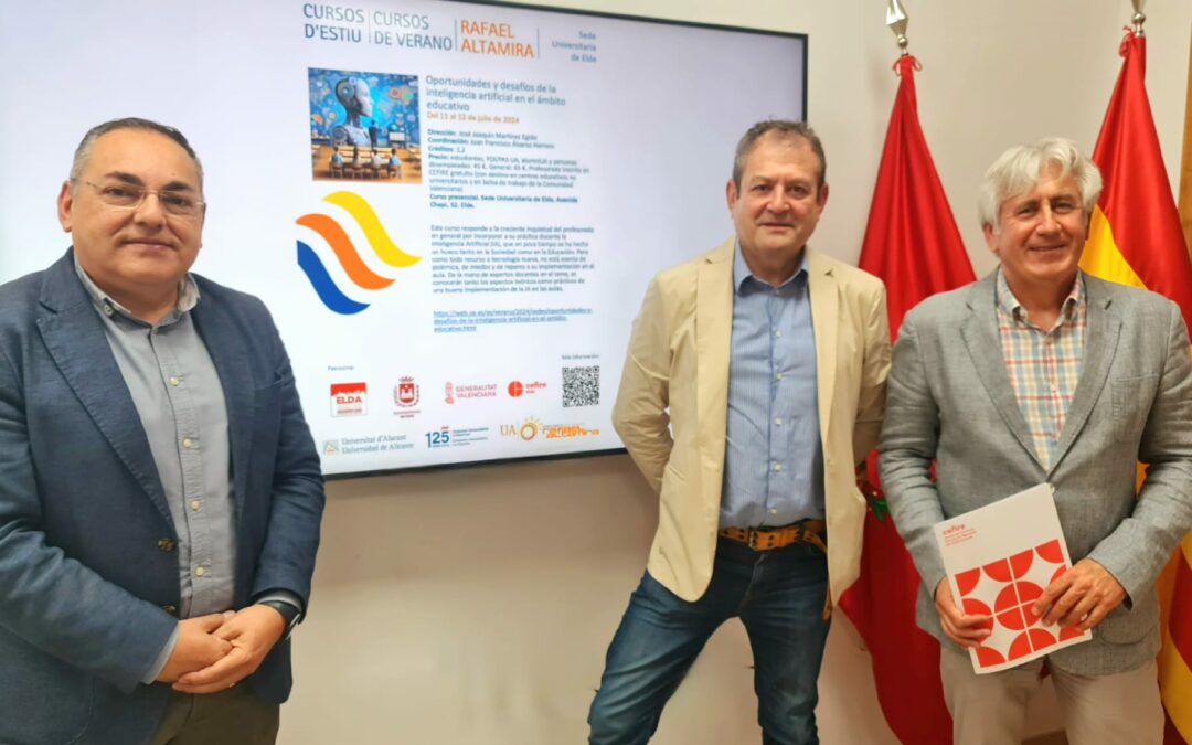El concejal de Relaciones con la Universidad, Enrique Quílez, el director de la Sede de la UA en Elda, José Joaquín Martínez Egido, y el director del CEFIRE Elda, Paül Limorti, han presentado esta mañana la propuesta formativa para este verano que se enmarca en los cursos de verano Rafael Altamira de la Universidad de Alicante. El edil de Relaciones con la Universidad ha afirmado que «estos cursos se realizan en colaboración con el CEFIRE de Elda y hacen propuestas que pretende abordar cuestiones de actualidad y que pueden resultar de interés a toda la sociedad. Se trata de un curso muy relevante e innovador porque permite entender algunos de los nuevos retos que se nos presentan».
