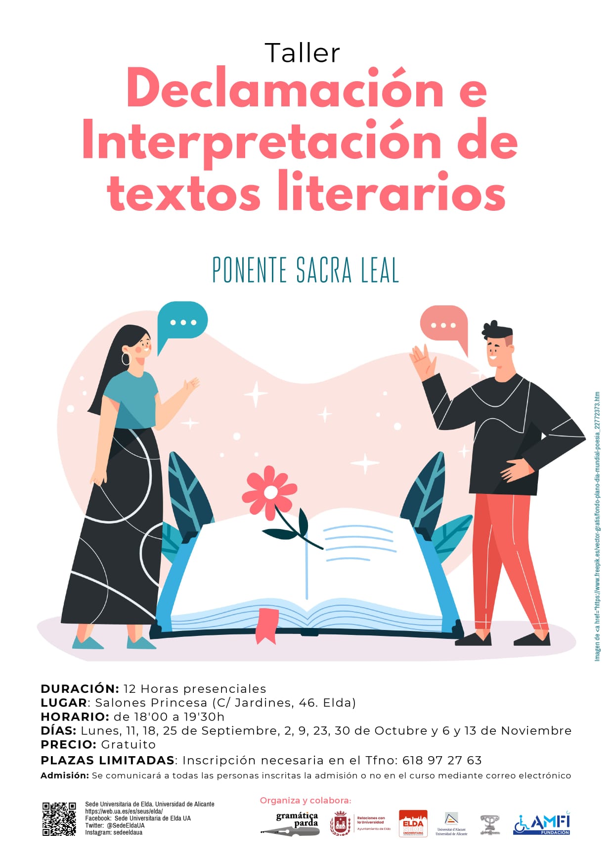 Días 11, 18 y 25 de septiembre; 2, 9, 23, 30 de octubre y 6 y 13 de noviembre, de 18.00 a 19.30 horas. Ponente: Sacra Leal. LUGAR: Salones Princesa (C/ Jardines, 46. Elda). Entrada gratuita, previa inscripción necesaria en el teléfono 618 97 27 63. Plazas limitadas. Se comunicará a todas las personas inscritas la admisión o no en el curso mediante correo electrónico