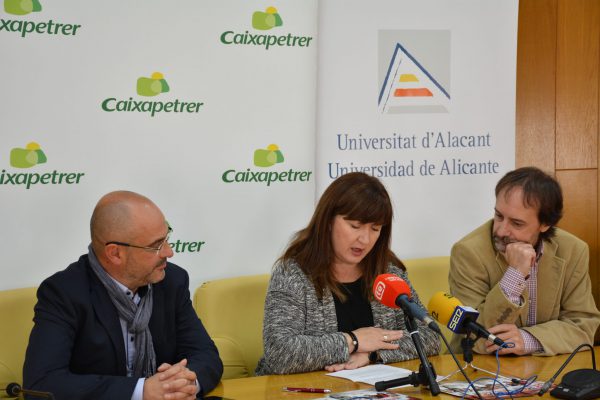 La directora de la Sede Universitaria de Elda, Charo Navalón, el coordinador académico de la Sede Universitaria de Petrer, Pedro Payá, y el Director General de Caixapetrer, Miguel Ángel Erades, han presentado hoy a los ganadores de los I Premios a la Investigación Joven.