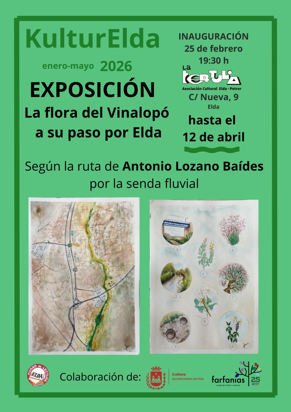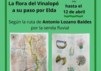 La programación se completa con la inauguración, el miércoles 25 de febrero a las 19:30 horas, de la exposición fotográfica ‘La flora del Vinalopó a su paso por Elda’, que recoge 50 plantas que habitan en el cauce del río, mostrando la riqueza natural de su entorno realizado durante varios años por Antonio Lozano Baídes, quien ha documentado el entorno botánico del paraje, resaltando las peculiaridades de especies autóctonas y endémicas, así como otras alóctonas e incluso invasoras adaptadas al medio.