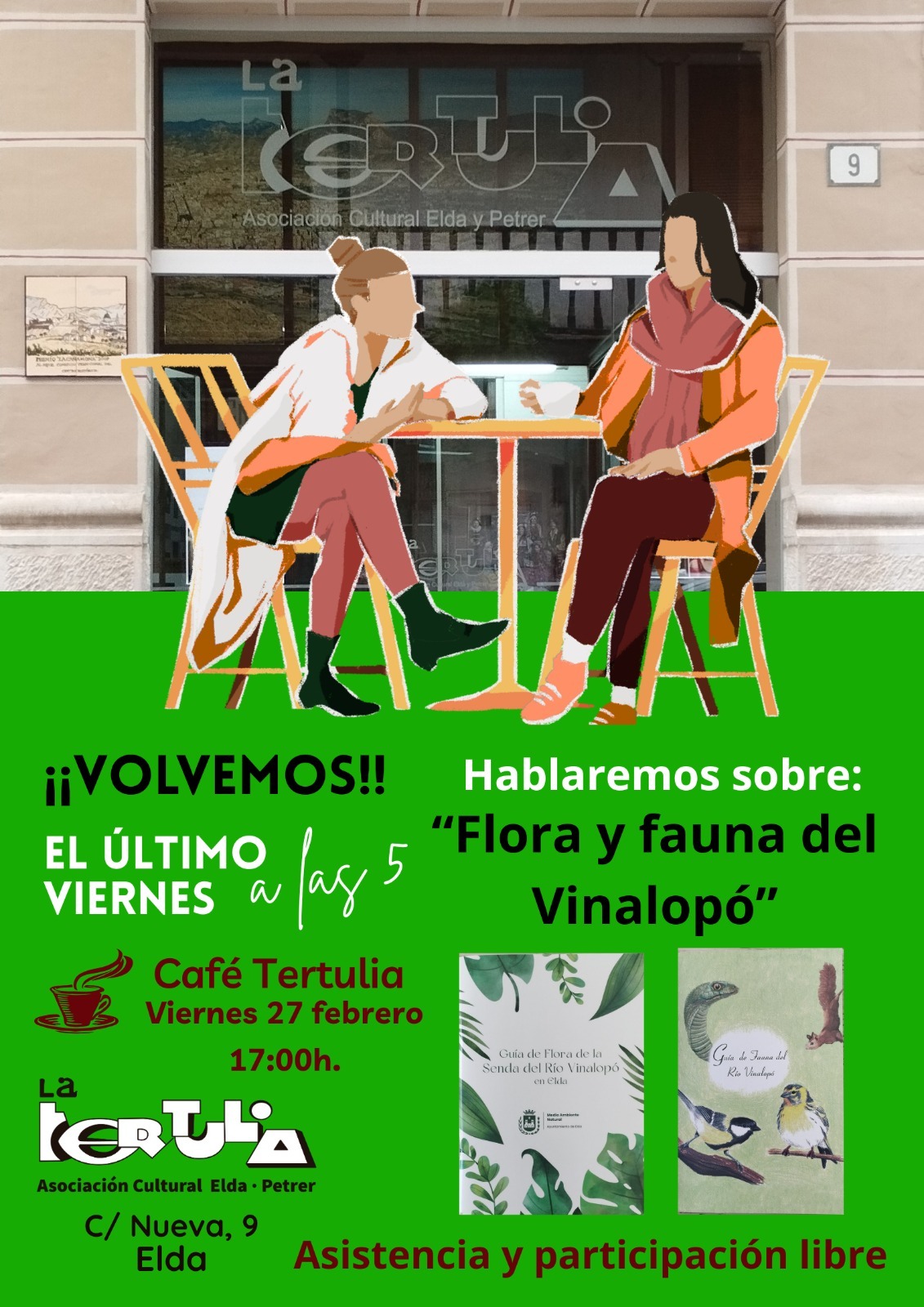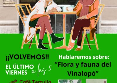 La Tertulia vuelve a abrir sus puertas con su habitual café-tertulia de fin de mes, que se celebrará el viernes 27 de febrero a las 17:00 horas en su sede de la calle Nueva, 9. En esta ocasión, el tema de debate será ‘Flora y Fauna del Vinalopó’, centrado en el cauce natural del río a su paso por Elda. La iniciativa surge a raíz de la publicación de guías divulgativas por parte de la Concejalía de Medio Ambiente Natural y Protección Animal.