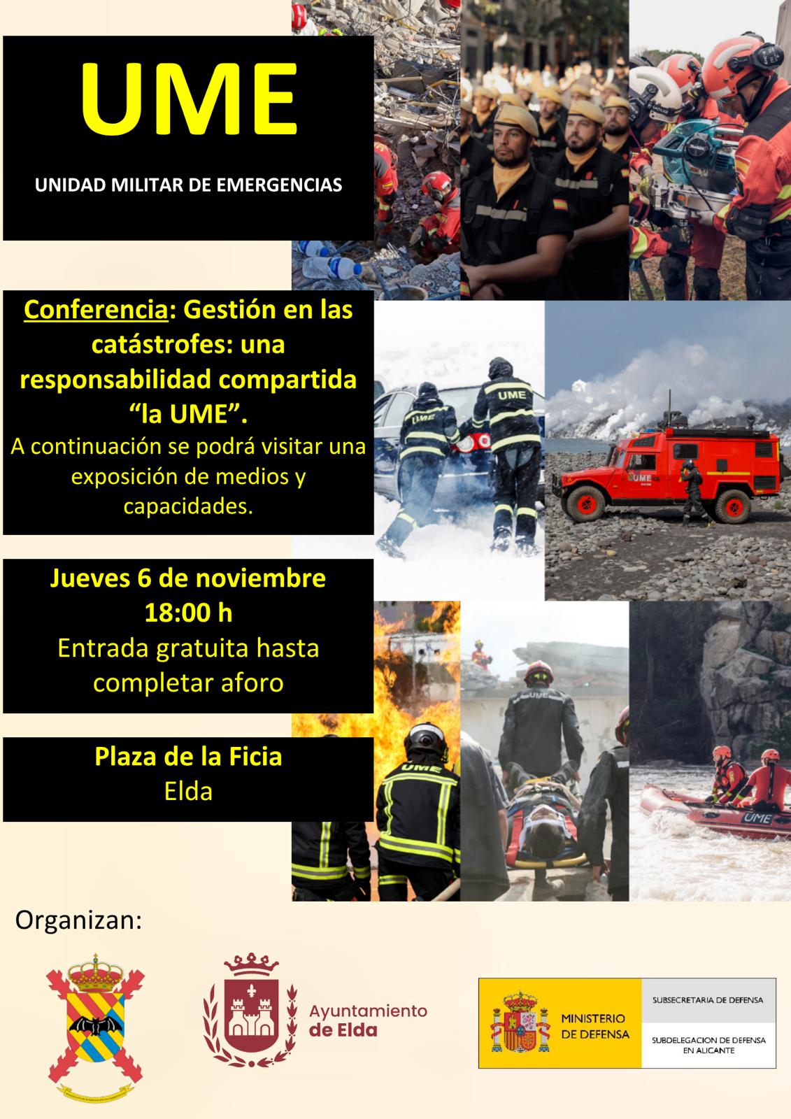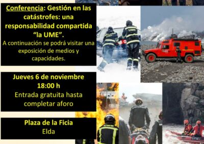 La exhibición de material dará comienzo por la mañana, de 9.00 a 13.00 horas, franja horaria en la que también asistirán los alumnos y alumnas de centros educativos de Elda que han mostrado su interés en acudir. A las 10.00 horas, los mandos de la UME ofrecerán una charla al alumnado del Grado de Seguridad y Medio Ambiente en el salón de actos del Centro Cívico. Por la tarde, la exhibición estará abierta de 16.00 a 18.00 horas. Además de exhibir los medios materiales, los mandos de la UME ofrecerán a las 18:00 horas una conferencia abierta a todo el público sobre la gestión en las catástrofes. Tendrá lugar en el salón de actos del Centro Cívico y Juvenil, con entrada libre hasta completar el aforo.