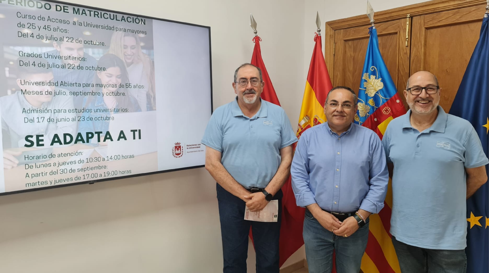 La UNED Aula de Elda ha dado a conocer esta mañana los plazos de matriculación de su oferta formativa para el próximo curso. El concejal de Relaciones con la Universidad, Enrique Quílez, el coordinador de la sede de la UNED en Elda, José Manuel Guardia, y el responsable del Negociado de Alumnado, Antonio Melgarejo, han presentado también la programación del curso 2024-25.