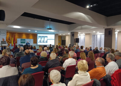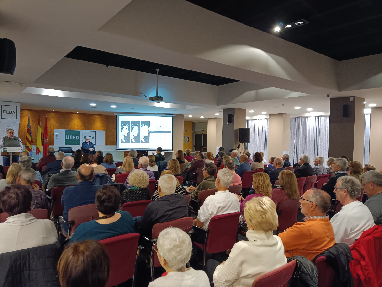 El director y guionista del documental, el eldense Manuel de Juan, estuvo presente en el acto, que contó con la asistencia de más de 200 personas y en el que también estuvieron presentes los concejales de Relaciones con la Universidad, Enrique Quílez, y de Cultura y Patrimonio Histórico, Iñaki Pérez, así como la edil de Educación y de Memoria Democrática, María Gisbert.