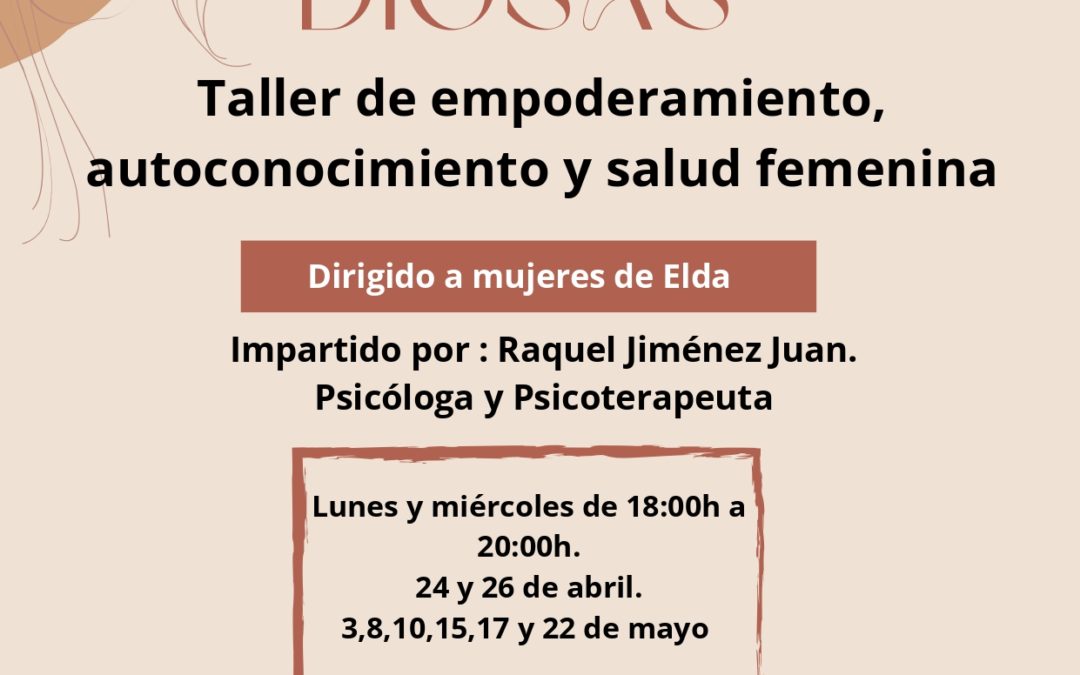 El Instituto Municipal de Servicios Sociales de Elda (IMSSE), a través de la Unidad de Igualdad, ha programado dos talleres dirigidos a las mujeres de Elda, impartidos por Raquel Jiménez Juan, psicóloga y psicoterapeuta, con formación en igualdad y prevención de la violencia de género. ‘Diosas’, un taller en el que, a través de diferentes actividades, se abordará el empoderamiento, el autoconocimiento y la salud femenina y ‘Liderazgo femenino’, a través del cual se potenciarán herramientas para desarrollar y proyectar la consecución de los objetivos vitales.