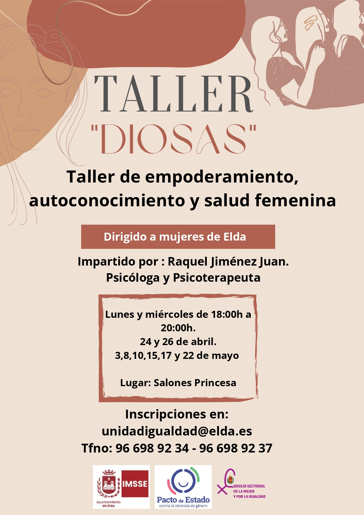 El taller ‘Diosas’ se llevará a cabo los días 24 y 26 de abril, y 3, 8, 10 , 15, 17 y 22 de mayo en horario de 18:00 a 20:00 horas, también en los Salones Princesa (c/Jardines, 46).