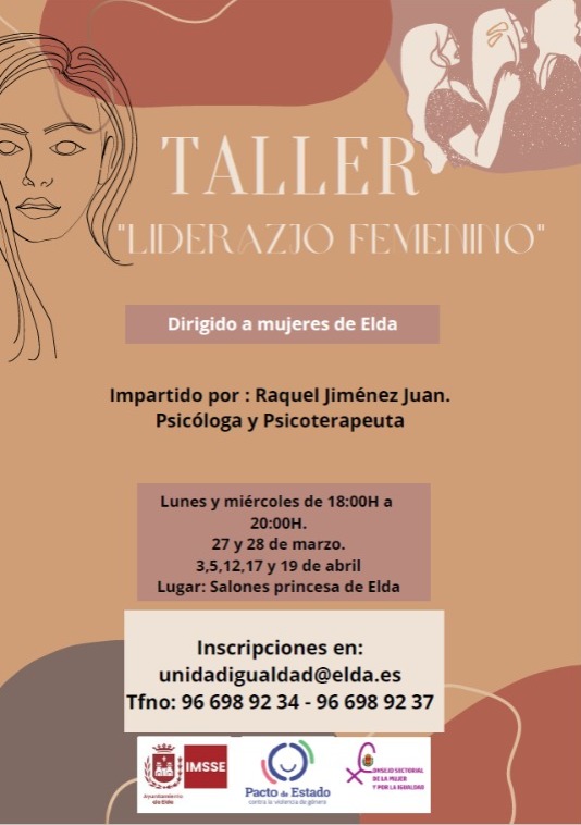 Las sesiones del taller ‘Liderazgo femenino’ se llevarán a cabo los días 27 y 28 de marzo y 3, 5 ,12, 17 y 19 de abril en horario de 18:00 a 20:00 horas, en los Salones Princesa (c/ Jardines, 46)