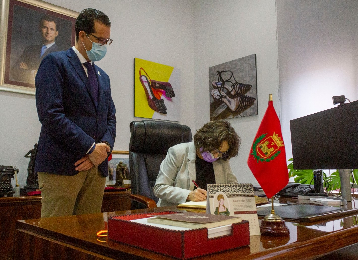 Rubén Alfaro ha recibido a Mónica Oltra en el vestíbulo del Ayuntamiento, donde le ha mostrado la vara de mando de Manuel Azaña. A continuación, la vicepresidenta de la Generalitat ha firmado en el Libro de Honor de la ciudad. El alcalde de Elda, acompañado de la concejala de Bienestar Social, Alba García, ha dado la bienvenida a la vicepresidenta del Consell y ha indicado que “aunque coincidimos en muchas ocasiones en Valencia, para mí es un honor que esté hoy en nuestra ciudad. Es una visita importante porque vamos a tener una reunión con las trabajadoras sociales y con el equipo técnico y directivos del IMSSE”.