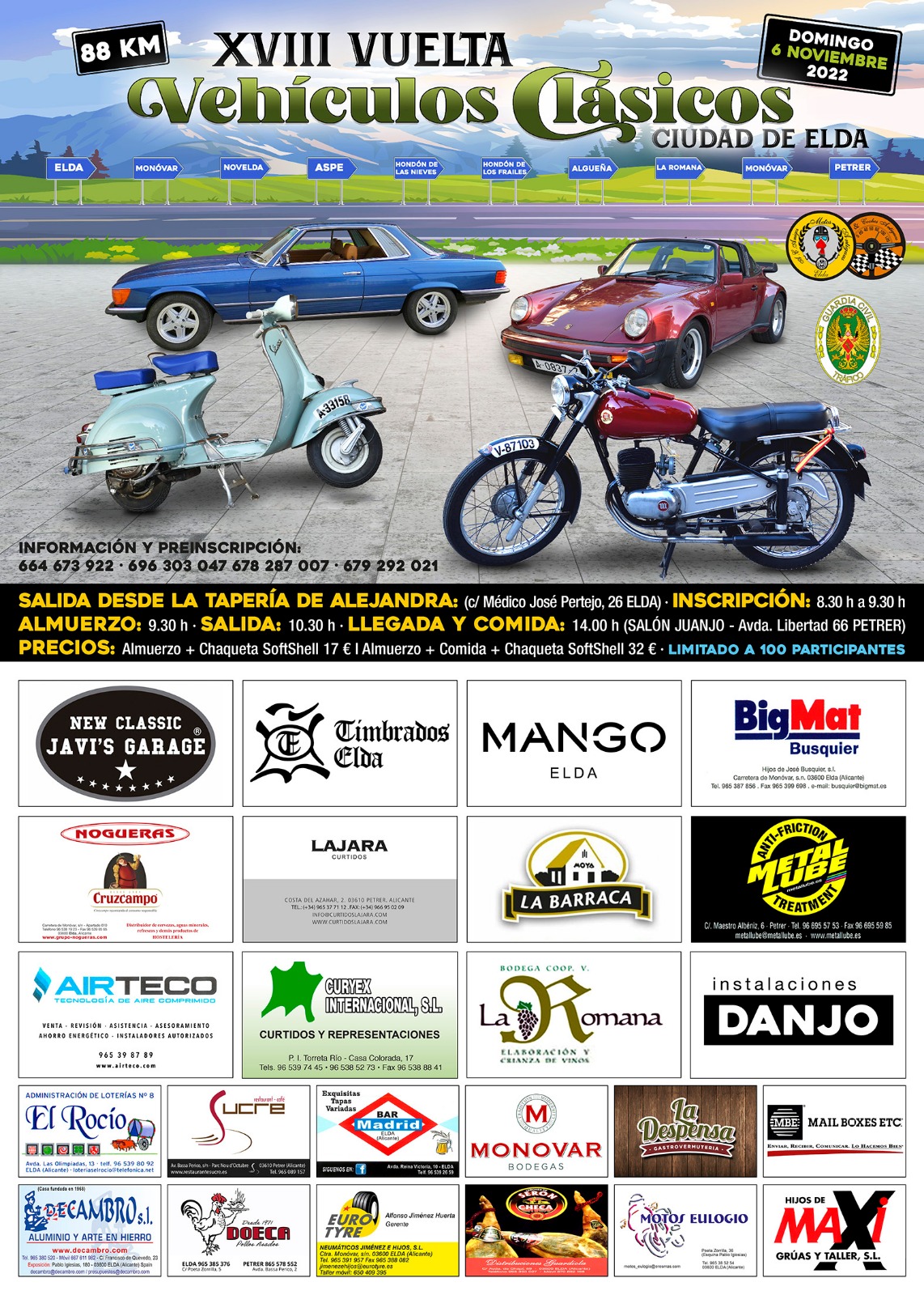 La Vuelta comenzará a las 8.30 horas en La Tapería de Alejandra, en la calle Médico José Pertejo, donde estarán expuestos todos los vehículos para quien quiera verlos de cerca. Desde aquí los participantes partirán a las 10.30 horas hacia Monóvar, Novelda, Aspe, Hondón de las Nieves, Hondón de los Frailes, Barbarroja, La Algueña, La Romana (parada en la Bodega Cooperativa), Monóvar y regreso a Elda con vuelta urbana por Reina Victoria y Gran Avenida para llegar a los Salones Juanjo.