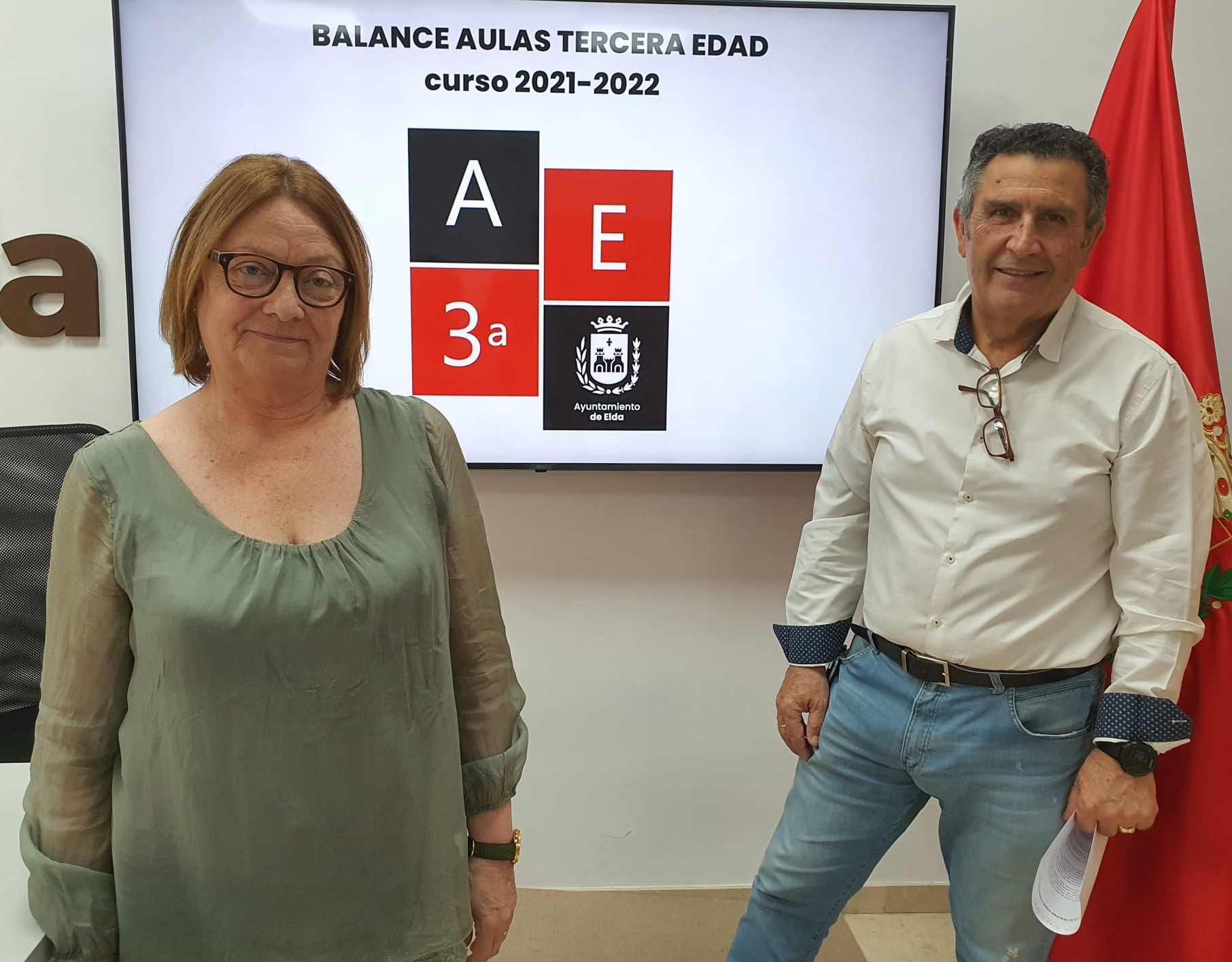 El concejal de Cultura, Amado Navalón, acompañado por la directora de las Aulas de la Tercera Edad de Elda, María Teresa Marín, ha hecho balance esta mañana del desarrollo del curso 2021-2022 en el que han participado más de 200 personas. Las actividades se han desarrollado en la sede de las Aulas de la Tercera Edad y en las instalaciones del CEFIRE, la UNED y los Salones Princesa.