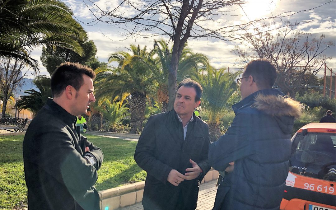 El alcalde de Elda, Rubén Alfaro, junto con el concejal de Mantenimiento de la Ciudad, Fernando Gómez, y Ginés Núñez, gerente de EULEN, ha anunciado el comienzo de las labores destinadas al mantenimiento de parques y jardines de Elda, tras la firma del contrato.