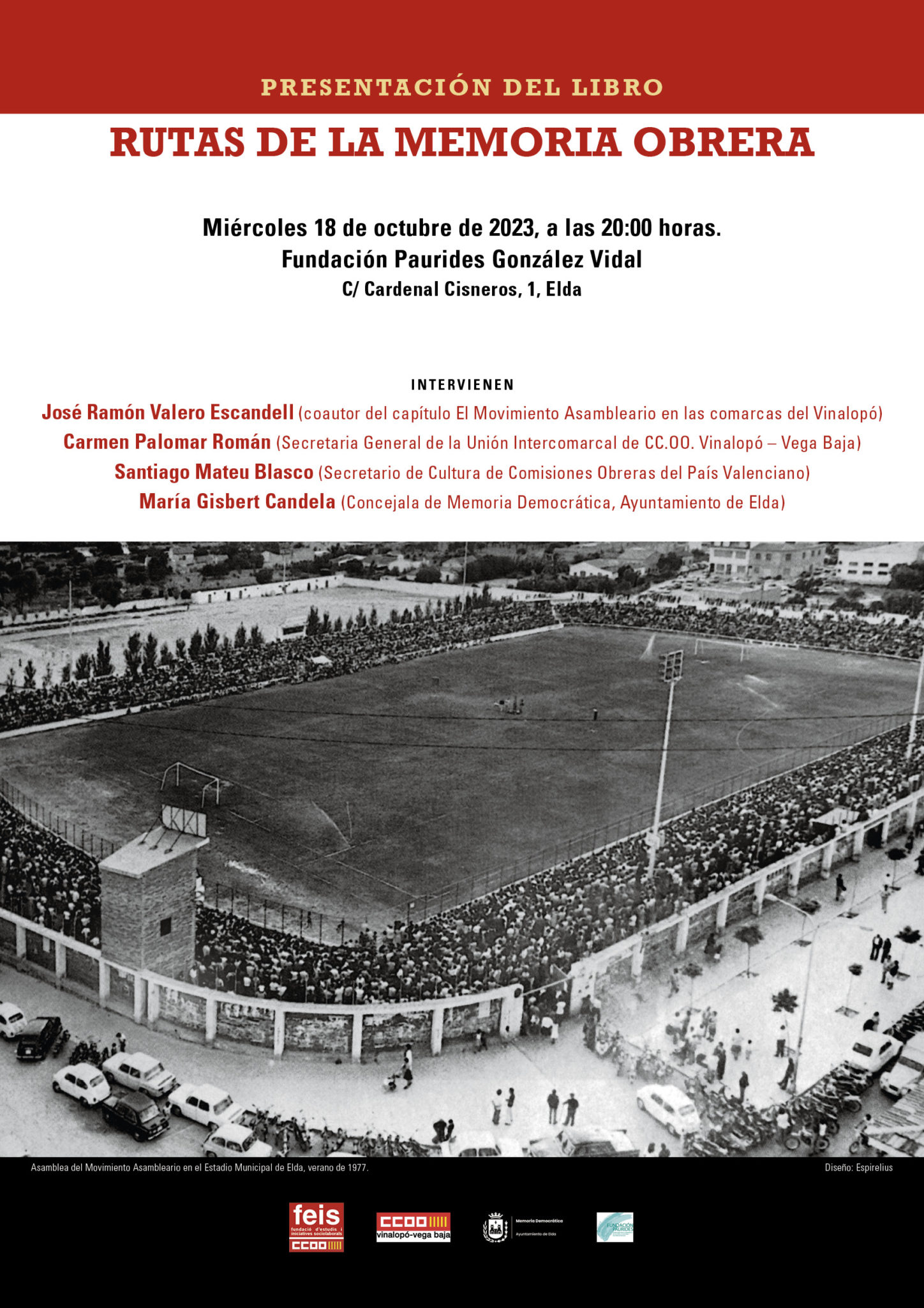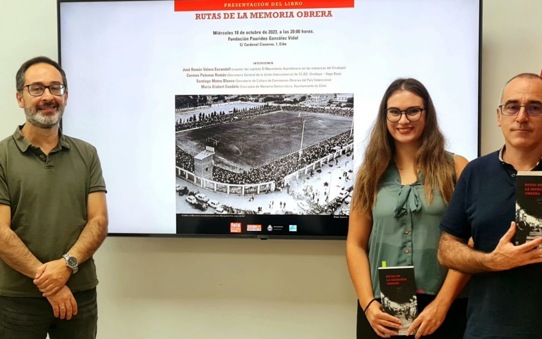 El próximo miércoles 18 de octubre a las 20.00 horas tendrá lugar la presentación del libro ‘Rutas de la Memoria Obrera’ en el salón de actos de la Fundación Paurides González Vidal. El acto es organizado por la Concejalía de Memoria Democrática del Ayuntamiento de Elda, con la colaboración de la Fundación de Estudios e Iniciativas Sociolaborales (FEIS) de la Confederación Sindical de Comisiones Obreras del País Valenciano, editora del libro.
