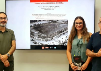 La concejala de Memoria Democrática, María Gisbert, acompañada de Alberto Gómez, en representación de la Fundación FEIS, y de Juan Carlos Márquez, técnico municipal de Patrimonio Histórico, ha indicado que «este libro hace una recorrido histórico en el que aparecen diversos lugares destacados del movimiento obrero de tierras valencianas».