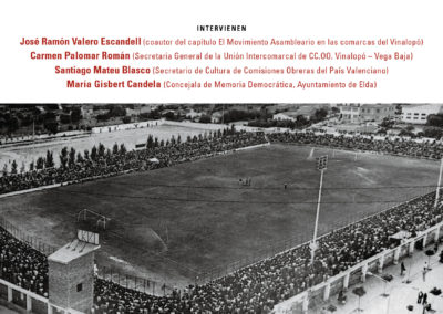 En la presentación intervendrán, además, Carmen Palomar Román (secretaria de la Unión Intercomarcal de CC.OO. Vinalopó-Vega Baja), Santiago Mateu Blasco (Secretario de Cultura de Comisiones Obreras del País Valenciano) y María Gisbert Candela (concejala de Memoria Democrática del Ayuntamiento de Elda). El acto es abierto y gratuito, limitado al aforo del local.