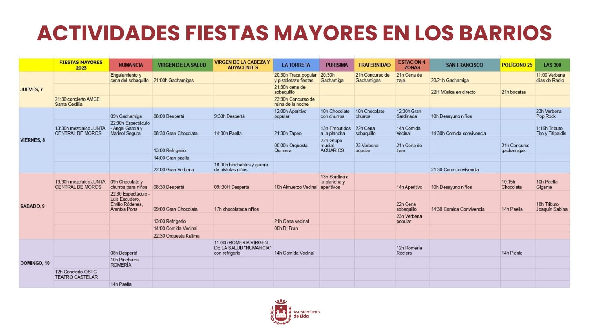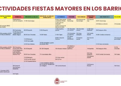 Los programas de fiestas preparados por cada asociación acogen actividades de diferente índole: gastronómicos, musicales, culturales, infantiles, entre otros, para el disfrute de vecinos y vecinas de todas las edades. En concreto, se han organizado fiestas de la espuma, almuerzos y comidas populares, concurcos de gachamigas, hinchables, campeonatos de juegos de mesa, verbenas, etc.