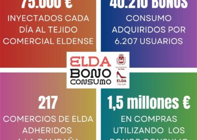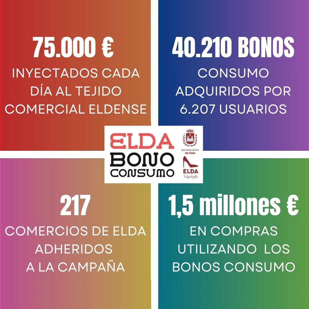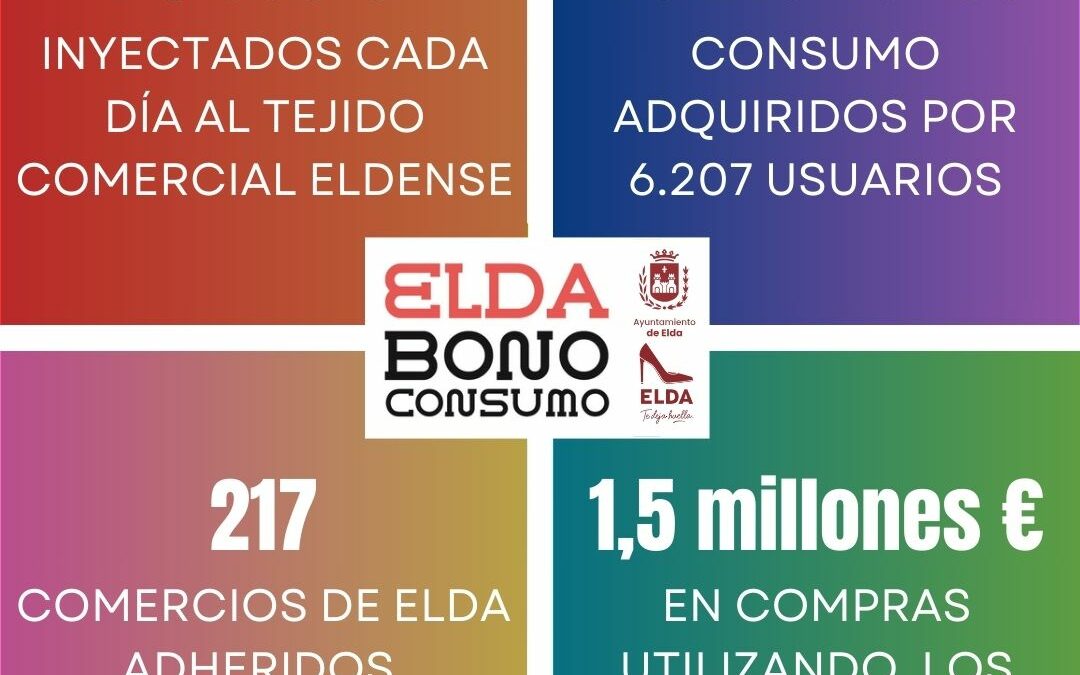 La campaña Bono Consumo Elda 2024 que finalizó ayer martes ha permitido inyectar más de 1,5 millones euros en el tejido comercial de la ciudad, lo que supone que el conjunto de 217 establecimientos y comercios eldenses adheridos obtuvieron una inyección extra de 75.000 euros diarios durante las tres semanas de duración de la campaña.