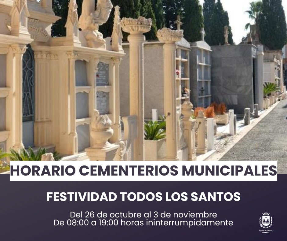 La Concejalía de Espacio Público del Ayuntamiento de Elda ultima los detalles para que todo esté a punto en los cementerios municipales de la ciudad de cara a la festividad de Todos los Santos. En ese sentido, desde el sábado 26 de octubre hasta el domingo 3 de noviembre ambos camposantos permanecerán abiertos de 8 a 19 horas, de manera ininterrumpida, facilitando de ese modo el acceso de toda la ciudadanía.