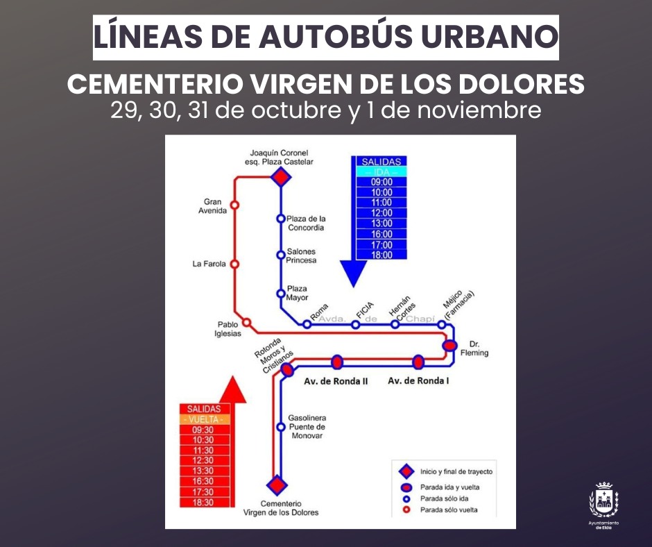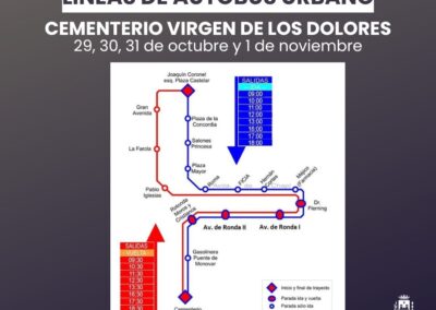 Por su parte, desde la Concejalía de Control de la Movilidad se dispondrá de un servicio especial de autobuses desde el día 29 de octubre hasta el propio 1 de noviembre con el objetivo de ofrecer un horario más amplio, con salidas cada hora a partir de las 9 de la mañana y la vuelta disponible hasta las 18.30 horas, con un breve receso del servicio a mediodía.
