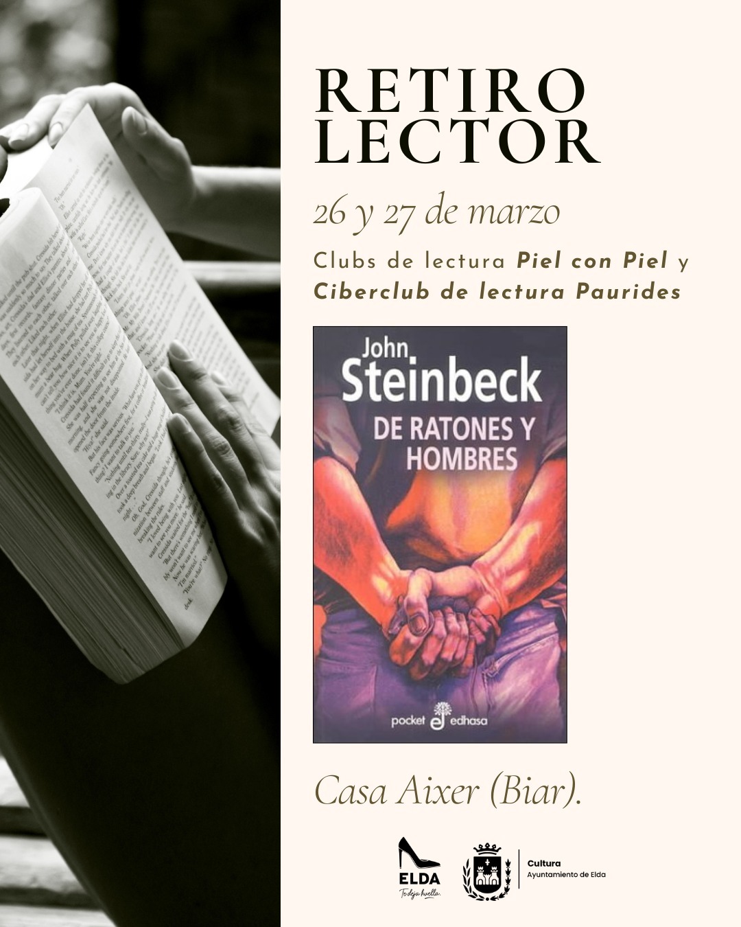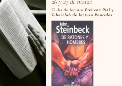 El Ayuntamiento de Elda, a través de la Concejalía de Cultura, colabora con los clubes de lectura ‘Piel con piel’ y ‘Ciberclub de lectura Paurides’ en la organización de una experiencia única para sus integrantes, los días 26 y 27 de marzo: un retiro lector en el que los participantes disfrutarán de un día completo de inmersión en la lectura y reflexión del clásico ‘De ratones y hombres’, de John Steinbeck. Esta iniciativa cuenta con el apoyo y colaboración de la concejalía de Cultura del Ayuntamiento de Elda.