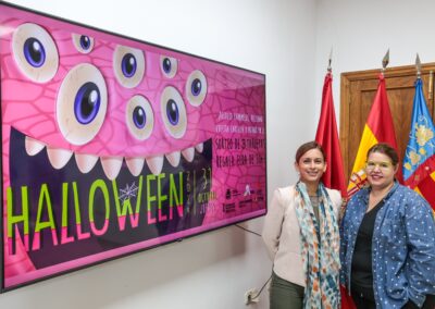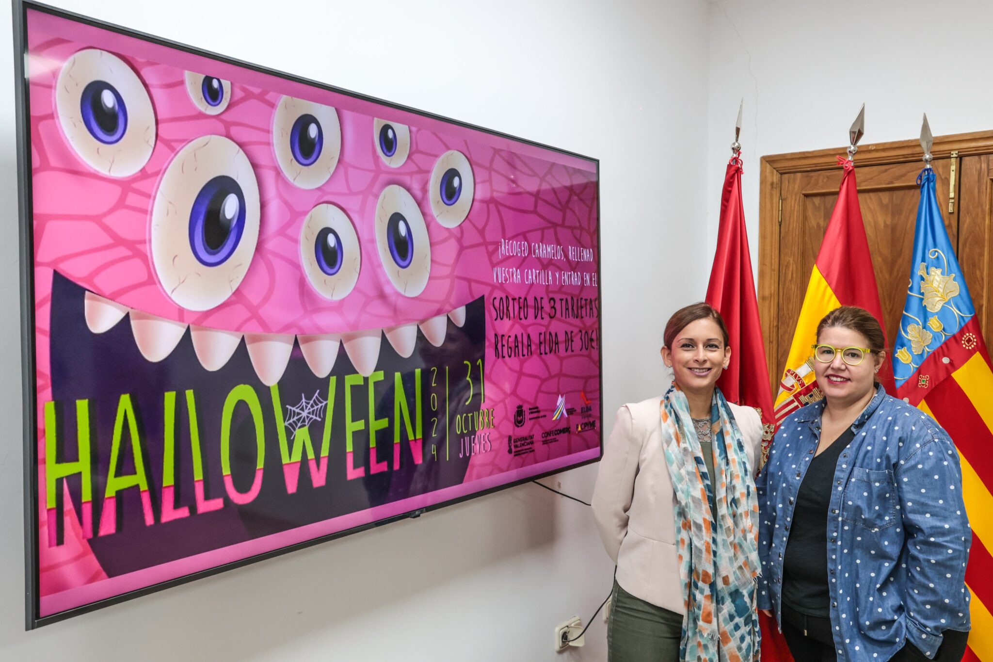 La concejala de Comercio y Mercados, Silvia Ibáñez, acompañada por la presidenta de la Asociación de Empresarios de Elda (AEDE), Rocío Vera, ha presentado esta mañana la campaña que algunos de los comercios asociados a AEDE, en colaboración con el Ayuntamiento de Elda, han puesto en marcha con motivo de la celebración de Halloween.