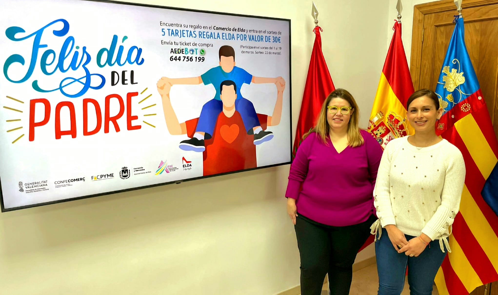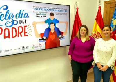 La concejala de Comercio y Mercados, Silvia Ibáñez, y la vicepresidenta de la Asociación de Empresarios de Elda (AEDE), Rocío Vera, han presentado esta mañana la campaña que con motivo de la celebración del Día del Padre han puesto en marcha los comercios asociados.