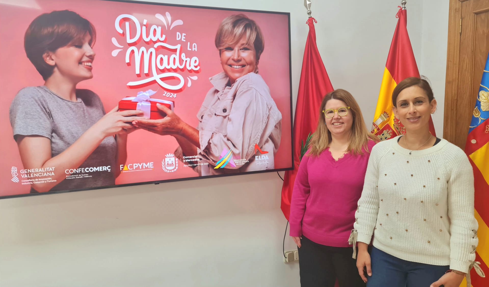 La concejala de Comercio y Mercados, Silvia Ibáñez, y la secretaria de la Asociación de Empresarios de Elda (AEDE), Sarai Navarro, han presentado esta mañana la campaña que con motivo del Día de la Madre han puesto en marcha los comercios de la ciudad adheridos a la Asociación.
