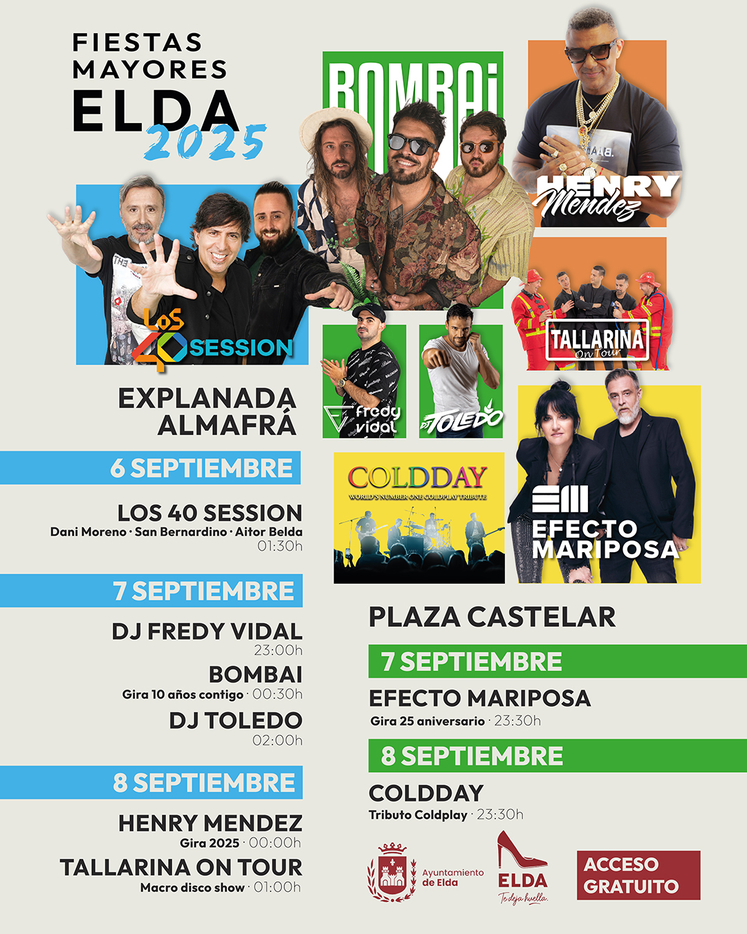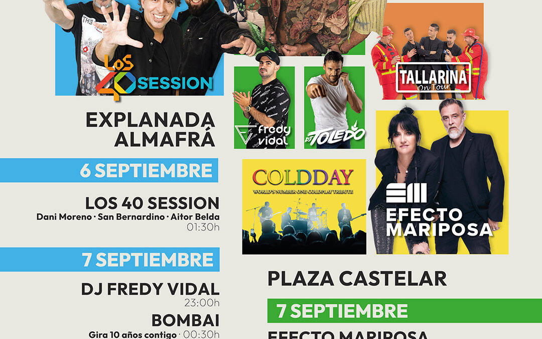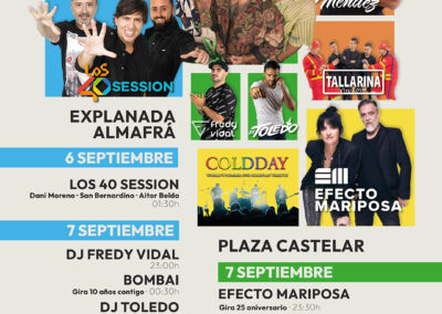 El día 8 de septiembre actuará a partir de las 23:00 horas en la Plaza Castelar el grupo barcelonés Coldday, considerada la banda que ofrece el mejor tributo a Coldplay en todo el mundo. Llevan trece años actuando por toda Europa repasando la discografía del grupo británico. Por último, la explanada de Nuevo Almafrá vivirá una gran fiesta de la mano del cantante y compositor dominicano Henry Méndez, muy popular por su mezcla de estilos latinos y música electrónica, y el espectáculo macro disco show de Tallarina On Tour.