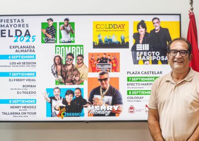 El concejal de Fiestas, David Guardiola, ha presentado esta mañana el cartel de conciertos de las Fiestas Mayores 2025 que, un año más, tendrán como escenarios la explanada de Nuevo Almafrá y la Plaza Castelar. La programación se desarrollará del 6 al 8 de septiembre y, como es habitual, el acceso será gratuito.
