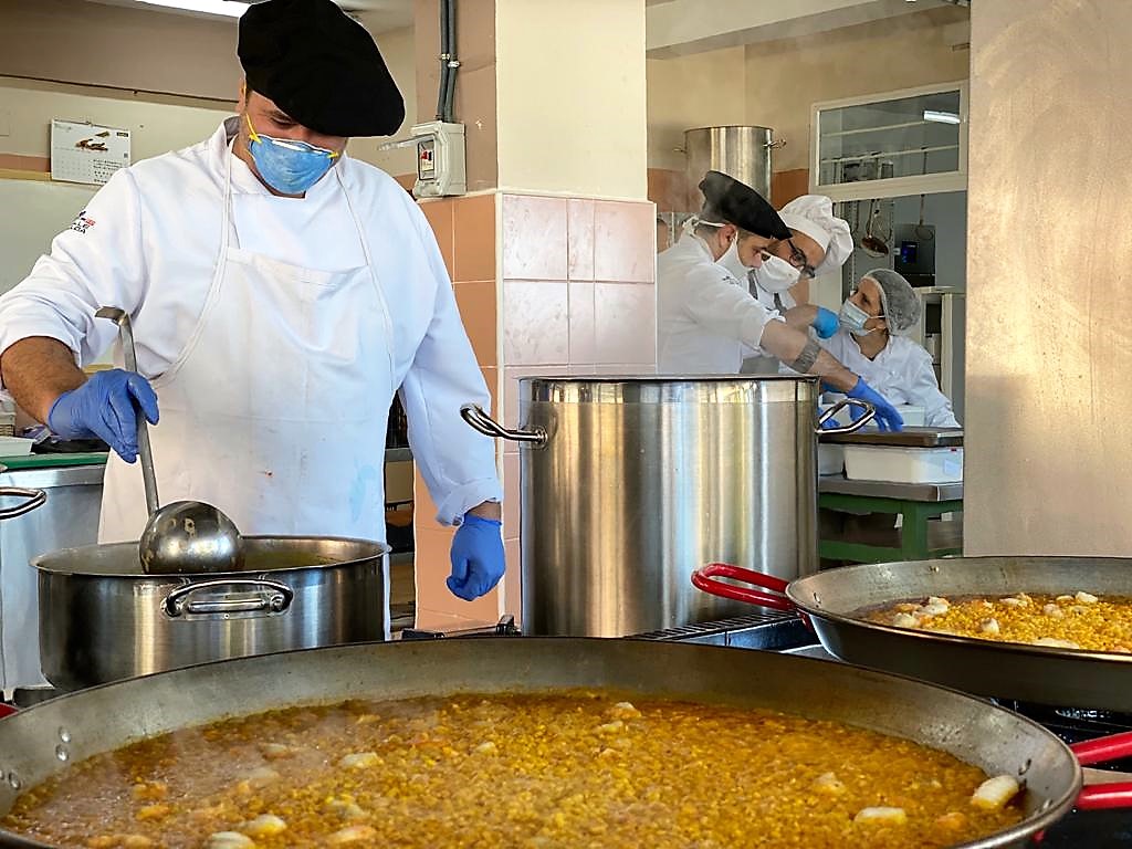 Los cocineros del CIPFP Valle de Elda han elaborado hoy 120 raciones de arroz con rape y langostino, caldereta de bacalao y macarrones a la boloñesa, que se entregan con pan y postre. Mañana volverán a preparar otras tantas raciones que también serán distribuidas por Cruz Roja entre las familias de Elda en riesgo de exclusión social.