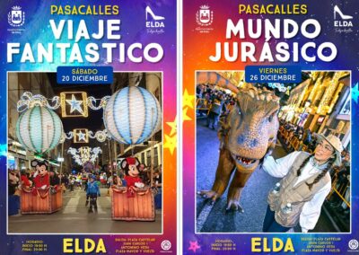 El mismo sábado, de 18:30 a 20:00 horas, se celebrará el pasacalles ‘Viaje Fantástico’, protagonizado por los personajes de Disney. El desfile partirá desde la Plaza Castelar y recorrerá las calles Juan Carlos I y Antonino Vera para finalizar en la Plaza Mayor. El viernes 26 de diciembre, con el mismo horario e idéntico recorrido, los protagonistas del pasacalles ‘Jurásico’ serán los dinosaurios.