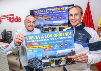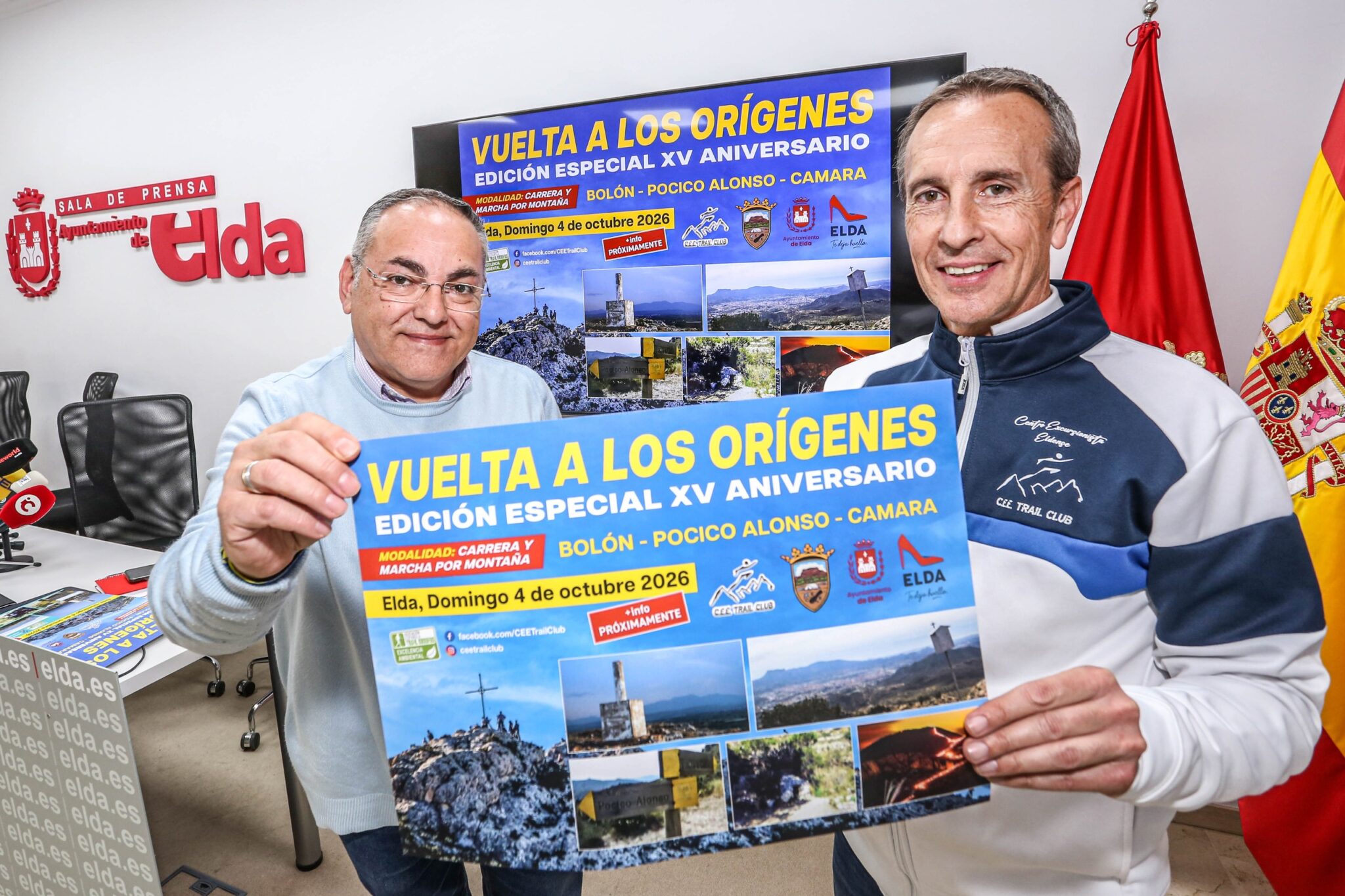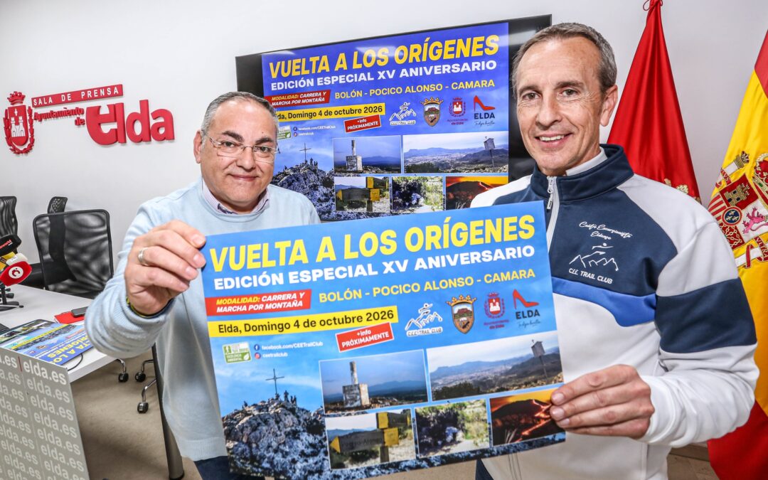 El concejal de Deportes, Enrique Quílez, acompañado por Pedro Ángel Navarro, presidente del CEE Trail Club, ha anunciado que el próximo 4 de octubre se celebrará en diferentes parajes naturales de Elda la competición ‘Vuelta a los orígenes’, prueba atlética compuesta por tres carreras diferentes en las que serán protagonistas espacios tan emblemáticos como el monte Bolón, el Pocico Alonso y Camara.