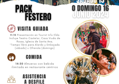 Se trata de un producto turístico dirigido a los turistas, a quienes se les facilita todo lo necesario para sumergirse de lleno en el ambiente que se respira esos días en Elda. El pack, con un precio cerrado de 50 euros, incluye visita guiada a la ciudad para el sábado 15 o el domingo 16 de junio con entrada, entre otros, al Teatro Castelar, la casa de la Viuda de Rosas o la Iglesia de Santa Ana, que será ofrecida por personal de la Oficina de Turismo de Elda.
