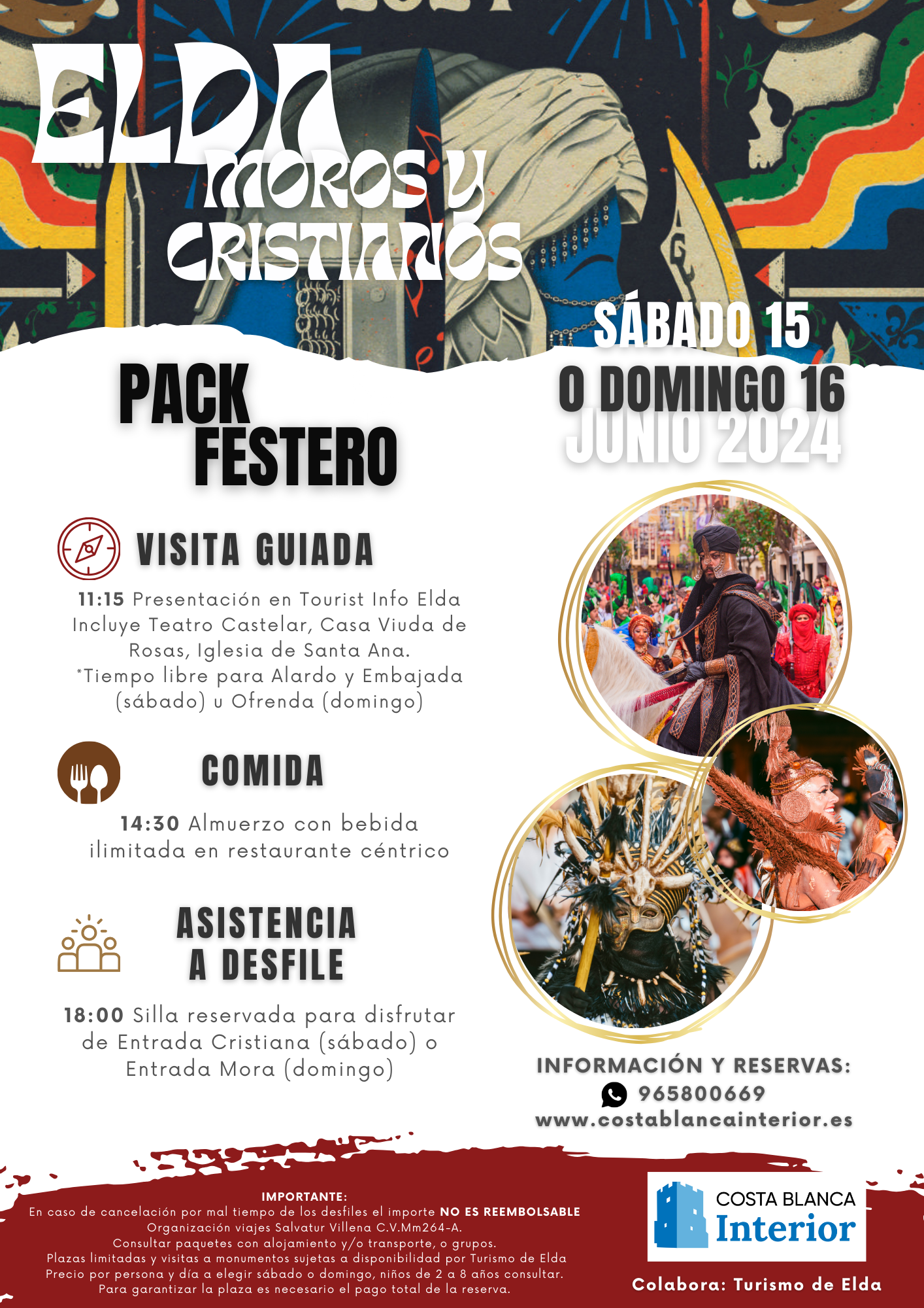 Además, el pack también incluye una comida en un restaurante del centro de la ciudad, con bebidas incluidas, y silla reservada para poder disfrutar de la Entrada Cristiana o de la Entrada Mora. Opcionalmente, las personas que lo deseen pueden reservar alojamiento a través de la agencia que gestiona el pack. Para más información y reservas, las personas interesadas pueden llamar al teléfono 965 800 669 o acceder a la web www.costablancainterior.es