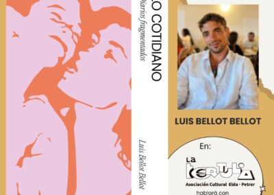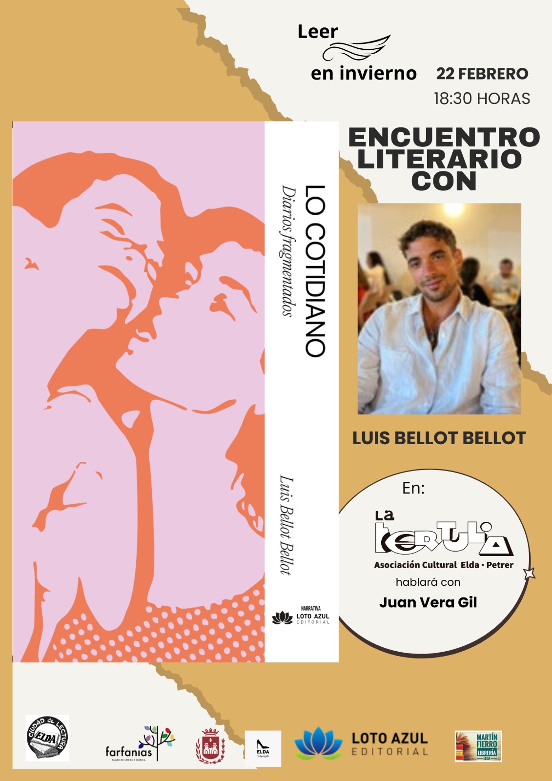 El próximo sábado 22 de febrero, a las 18:30 horas, tendrá lugar un nuevo encuentro literario en la Asociación Cultural ‘La Tertulia’. En esta ocasión, el protagonista será Luis Bellot que hablará de su nueva novela ‘Lo cotidiano. Diarios fragmentados’. La obra trata de un original diario en el que el autor recoge anécdotas y recuerdos de los momentos pasados en Granada, Elda y Madrid, los lugares en los que ha transcurrido su vida hasta el momento.