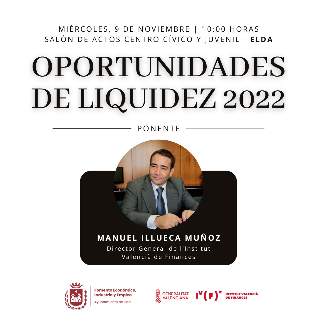 El director general del Instituto Valenciano de Finanzas (IVF), Manuel Illueca, ofrecerá mañana miércoles, 9 de noviembre, una conferencia en la que, bajo el título ‘Oportunidades de liquidez 2022’, explicará las herramientas que el IVF pone a disposición de las empresas, pymes y autónomos de Elda.