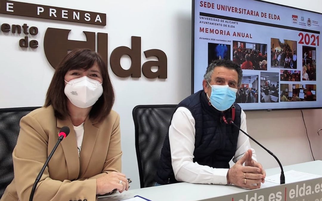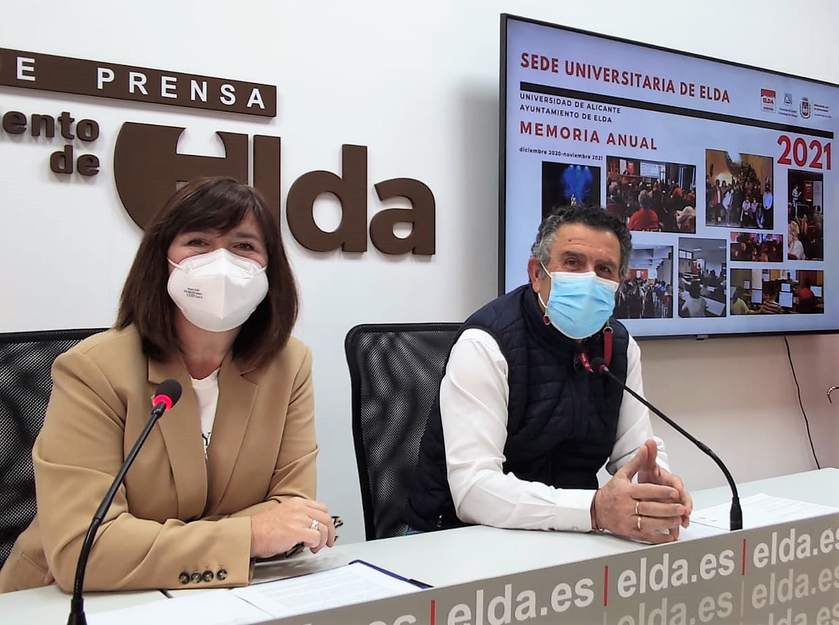 El concejal de Relaciones con la Universidad, Amado Navalón, y la directora de la Sede Universitaria de Elda, Rosario Navalón, han presentado hoy la Memoria de Actividades de la sede eldense. El balance, en palabra del concejal del área es “altamente satisfactorio, pues a pesar de la pandemia se han podido realizar actividades a lo largo del todo el año, con las lógicas adaptaciones de aforo y el estricto cumplimiento de las normas que se imponía en cada momento”.
