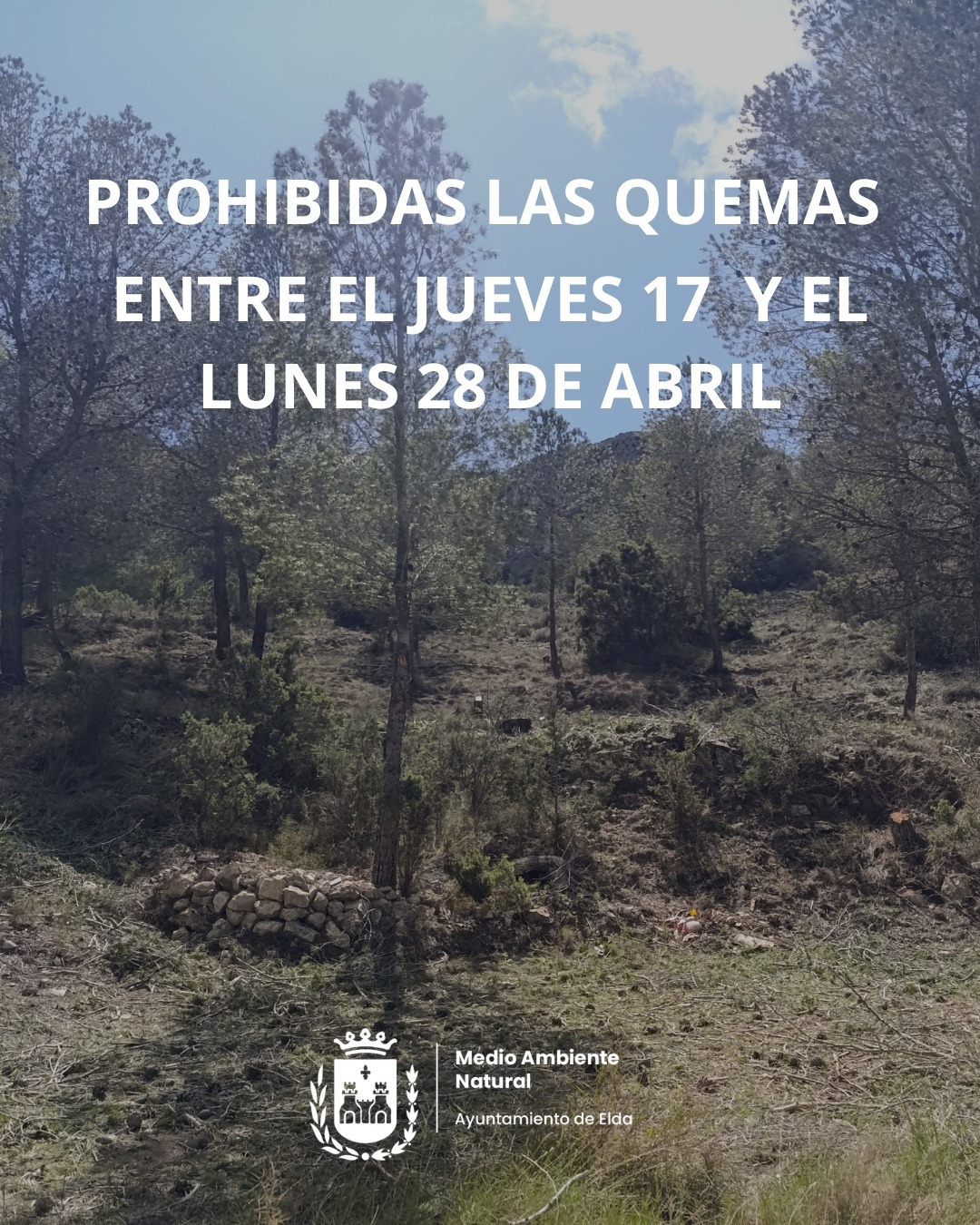 El Ayuntamiento de Elda, a través de la Concejalía de Medio Ambiente Natural, recuerda a la ciudadanía que debe respetar de manera estricta las prohibiciones establecidas por la Generalitat Valenciana en relación con la quema de residuos vegetales agrícolas y otras actividades relacionadas con el uso del fuego entre el 17 al 28 de abril.