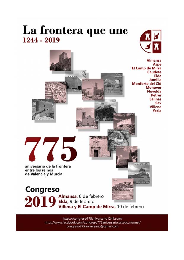 ElCongreso 775 aniversario de la frontera entre los reinos de Valencia y Murcia (1244-2019: origen del estado de los Manuel). La frontera que une, tendrá lugar los días 8, 9 y 10 de febrero de 2019 en Almansa (día 8), Elda (día 9) y Villena y Camp de Mirra (día 10, salida técnica).