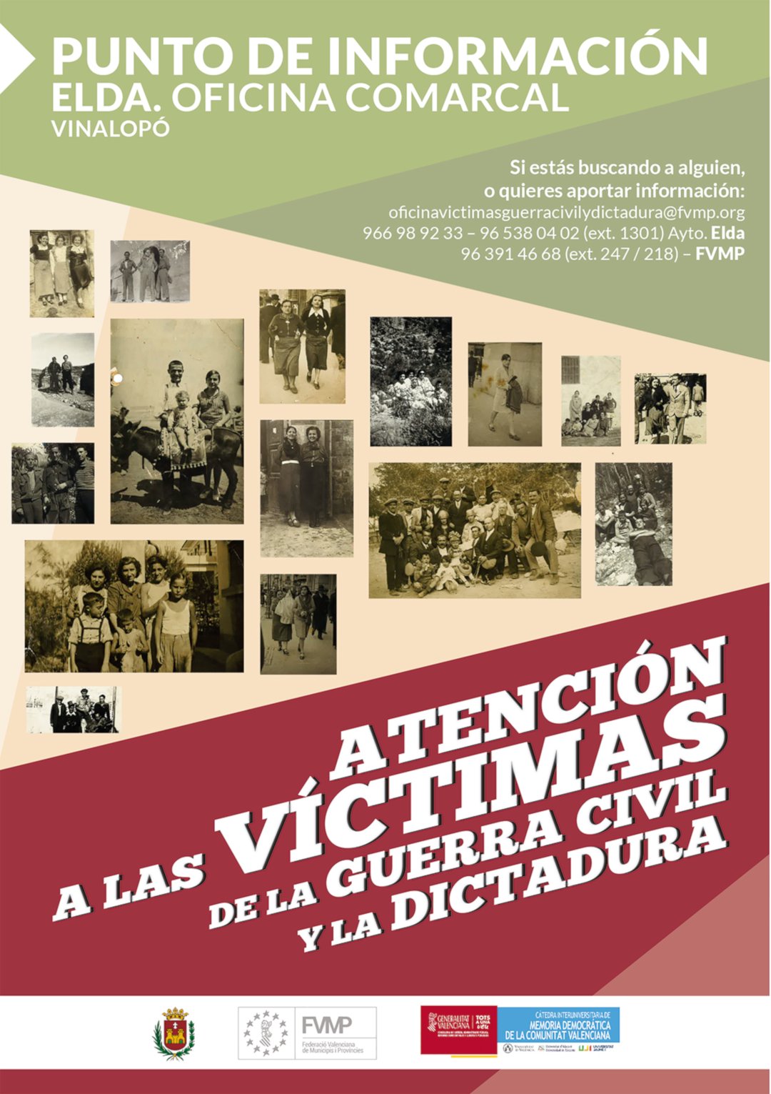 Patrimonio Cultural Castillo-Palacio de Elda Pintura Mural Torre medieval de la Torreta Yacimiento arqueológico El Monastil Plaza de Arriba Proyectos Conoce el Yacimiento Arqueológico EL MONASTIL Concurso de Ideas Plaza de Toros Congreso 775 Aniversario Elda Ciudad de acogida Elda Foral I Congreso de Patrimonio Histórico Cultural del Vinalopó II Congreso de Patrimonio Histórico Cultural del Vinalopó III Congreso de Patrimonio Histórico Cultural del Vinalopó IV Congreso de Patrimonio Histórico Cultural del Vinalopó Memoria Histórica Oficina de víctimas de la Guerra Civil y la Dictadura Personas y Personajes Proyecto la Llave de Elda Oficina de víctimas de la Guerra Civil y la Dictadura Horario: miércoles de 11 a 13 horas Ubicación:Museo Arqueológico de EldaC/ Príncipe de Asturias, 40 EntresueloElda Documentos Díptico